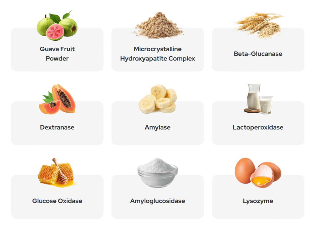 Glucose Oxidase– Produces low levels of hydrogen peroxide naturally inside the mouth, assisting in gentle antibacterial activity without harsh chemicals.